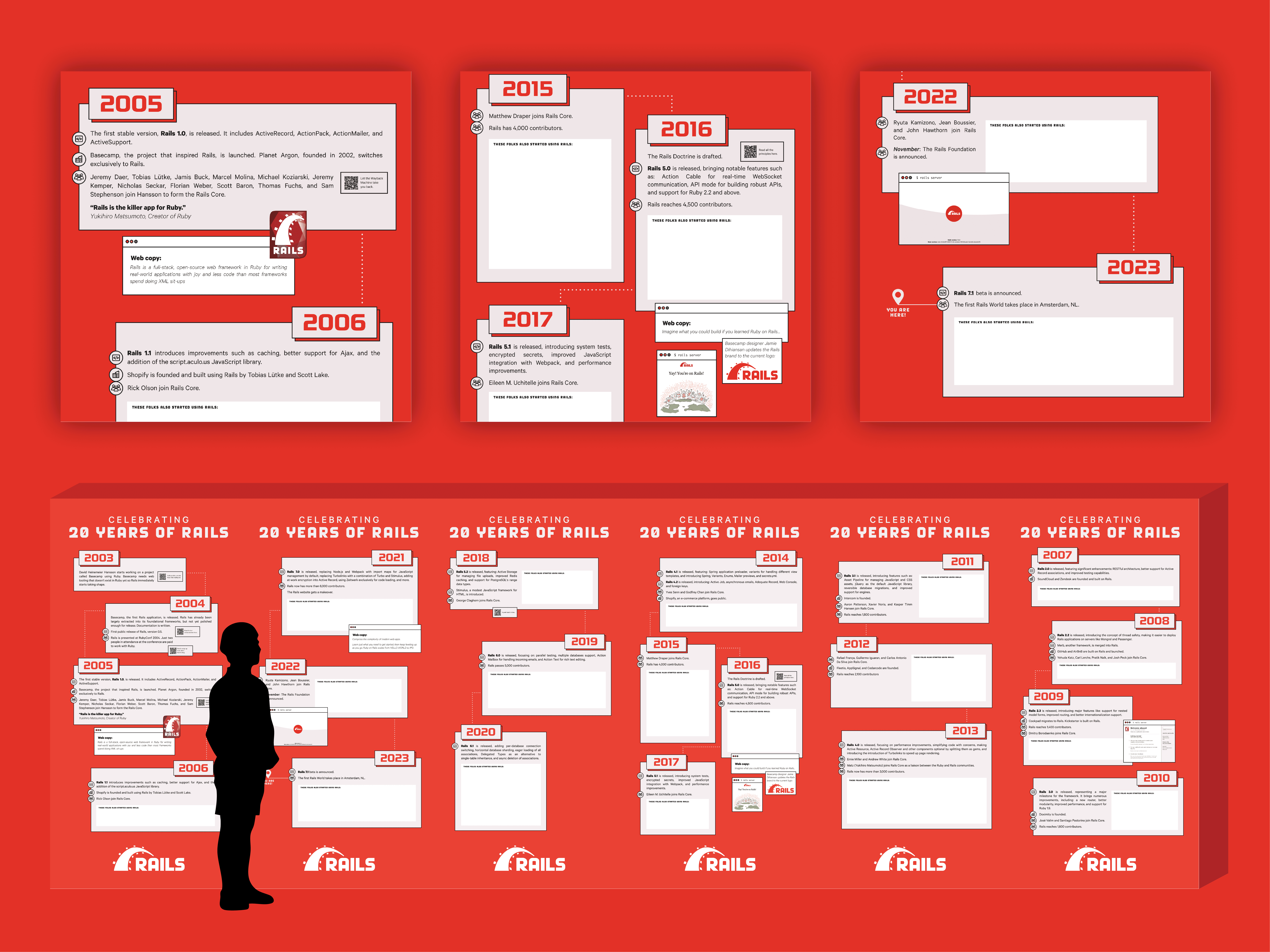 Rails World is the largest Ruby on Rails conference in the world, that takes places annually. Each year is a different city and, with that, a unique brand. I've had the pleasure to work with the Rails Foundation for a number of years as their lead designer for Rails World, and am responsible for creating everything from each year's identity, to on-site branding, website, and all marketing collateral.